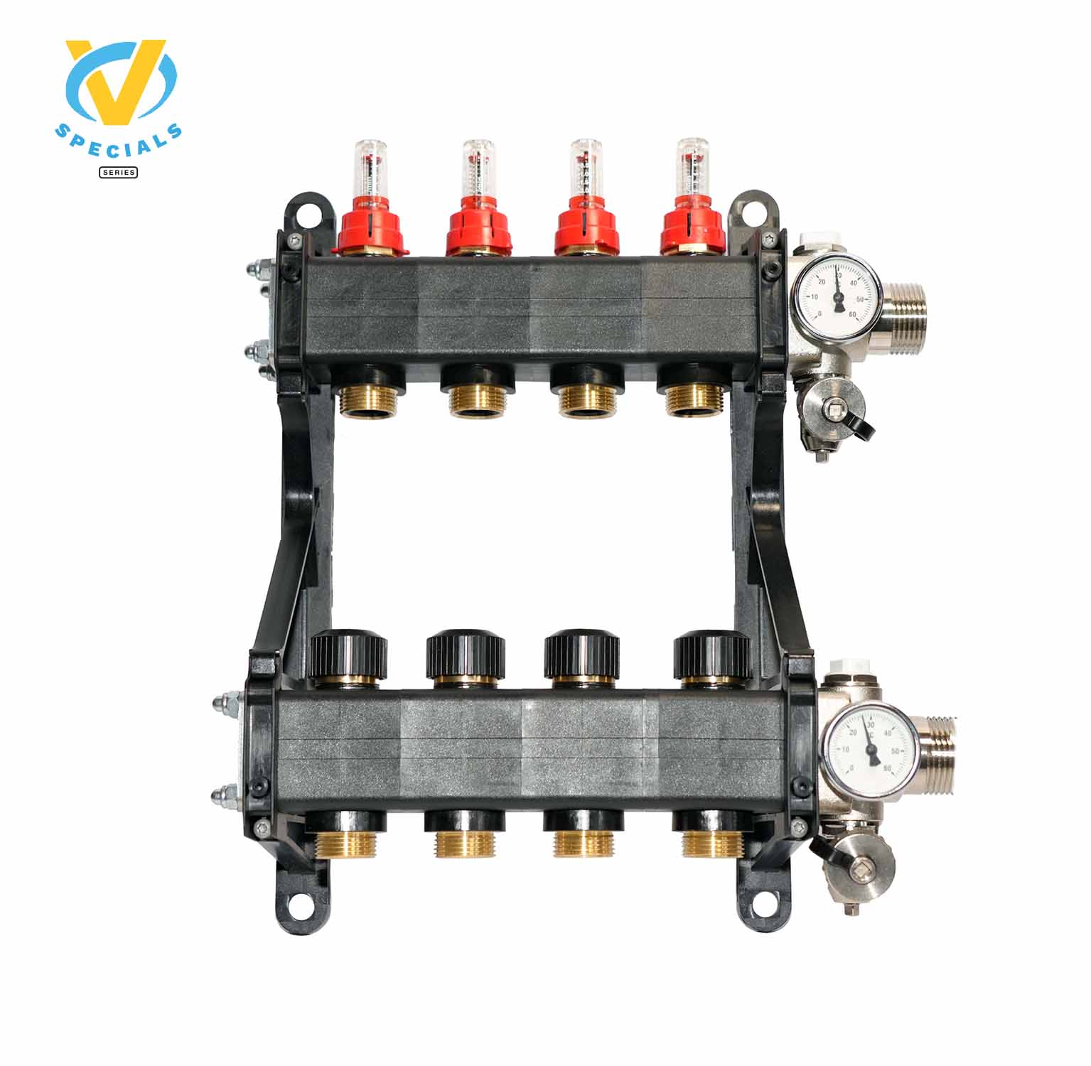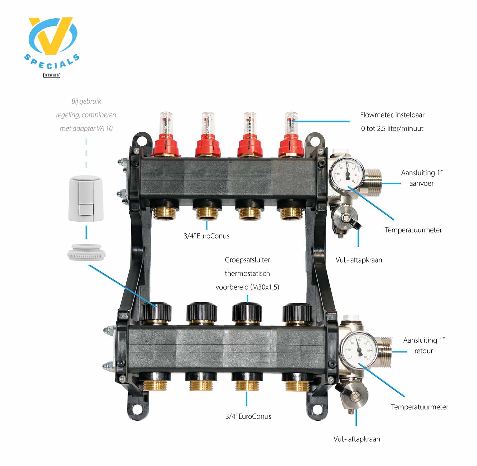 De groepsuitgangen zijn 3/4″ euroconus.