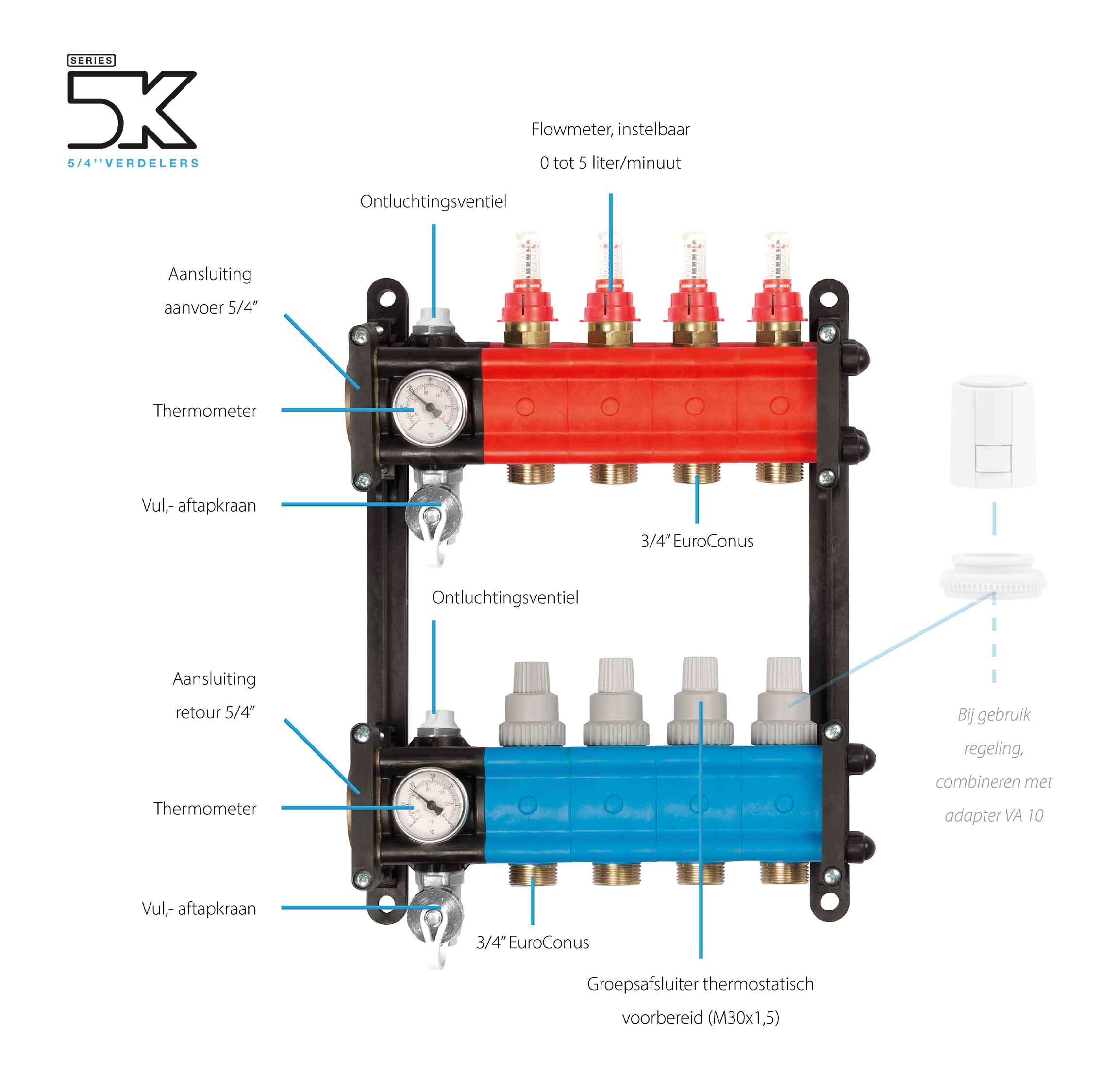 Onze kunststof verdelers zijn geschikt voor hoogtemperatuursystemen en zijn voorzien van een  maximaalbeveiliging om te voorkomen dat te heet water de vloer in wordt gelaten. Verder is de verdeler voorzien van inregelbare flowmeters waarmee de doorstroom van water per groep ingeregeld kan worden.